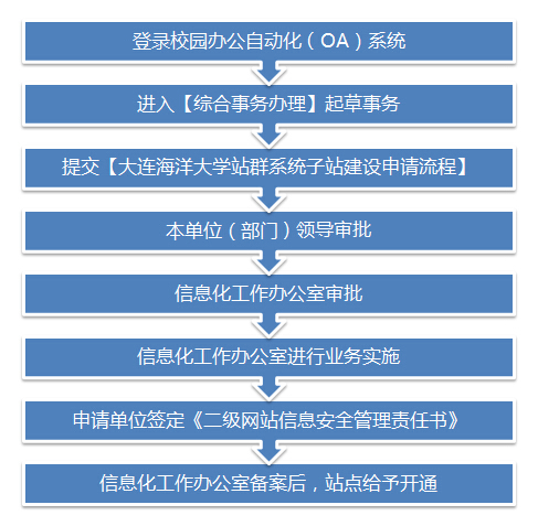 1. 申请单位(部门)需通过校园办公自动化(OA)系统【综合事物办理】,提交【大连海洋大学站群系统子站建设申请流程】申请;