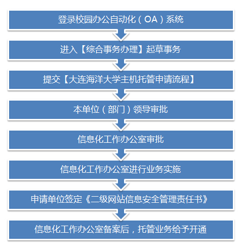 1. 申请单位(部门)需通过校园办公自动化(OA)系统【综合事物办理】,提交【大连海洋大学主机托管申请流程】申请;