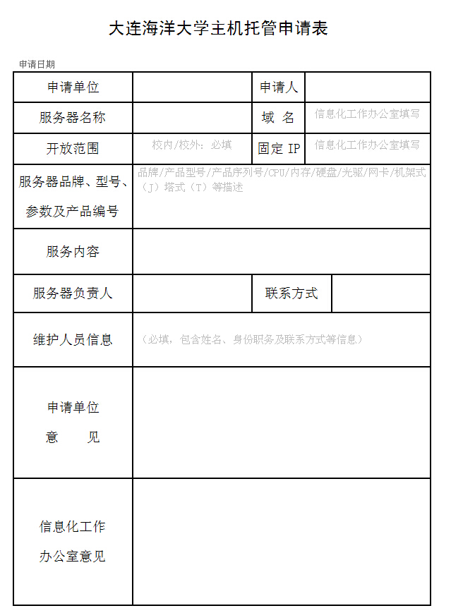 4. 申请单位签定大连海洋大学二级单位网络信息安全管理责任书,交与信息化工作办公室备案后,托管业务给予开通。