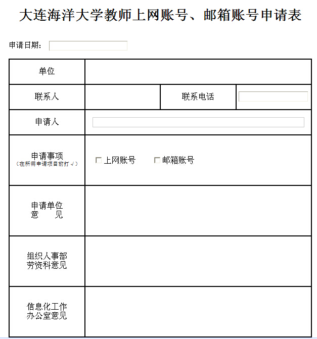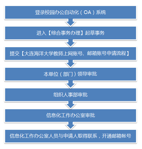 1. 申请人需通过校园办公自动化(OA)系统【综合事务办理】,提交【大连海洋大学教师上网账号、邮箱账号申请流程】选择“邮箱帐号”提交申请;